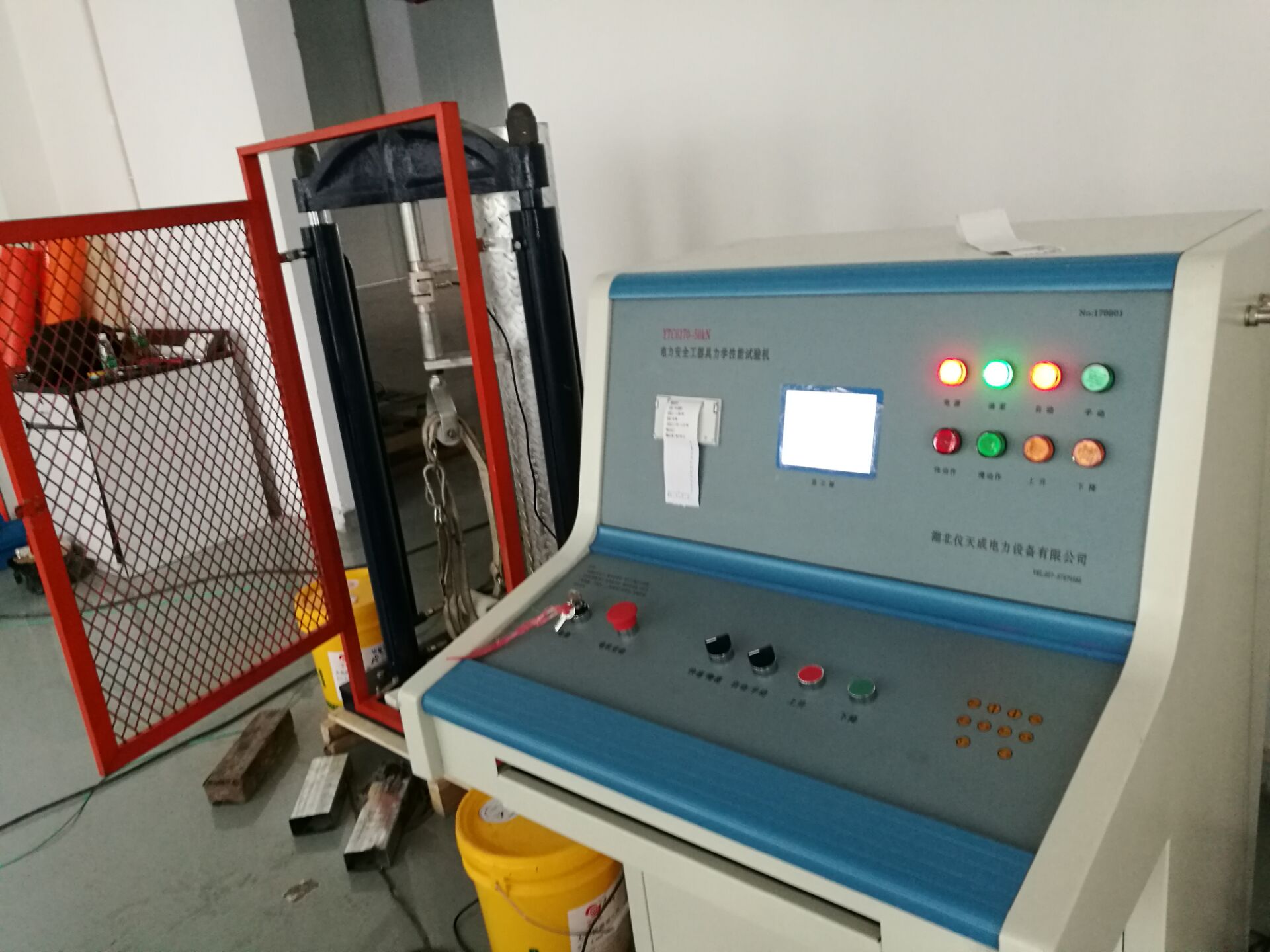 此次培訓(xùn)的重點(diǎn)設(shè)備是YTC6170電力安全工具器具力學(xué)性能測試機(jī),我公司研制的電子測力機(jī)(電力安全工器具力學(xué)性能試驗(yàn)機(jī)),符合國家電力公司《電力安全工器具預(yù)防性試驗(yàn)規(guī)程》要求,按《規(guī)程》完成各種預(yù)防性力學(xué)性能試驗(yàn)。本機(jī)由測試顯示和加力設(shè)備兩部分組成(如需測安全帽配安全帽試驗(yàn)臺(tái)) 測試顯示部分由拉壓力傳感器、控制鍵盤、液晶顯示屏、微型打印機(jī)、手動(dòng)按扭等組成。鍵盤使用薄膜輕觸鍵,使用手感好,液晶顯示為中文菜單式,操作人員可根據(jù)被試對象選擇相應(yīng)名稱菜單,當(dāng)需要對測試結(jié)果打印時(shí),可打印測試報(bào)告,便于備案檢查。本機(jī)設(shè)置兩個(gè)傳感器接口,傳感器3KN、100KN傳感器為測試安全工具之用。安全帽測試為測試安全帽專用。兩只傳感器既可單獨(dú)使用,也可同時(shí)使用。能滿足不同使用場所環(huán)境的要求和工作要求,性能穩(wěn)定,測試結(jié)果準(zhǔn)確。