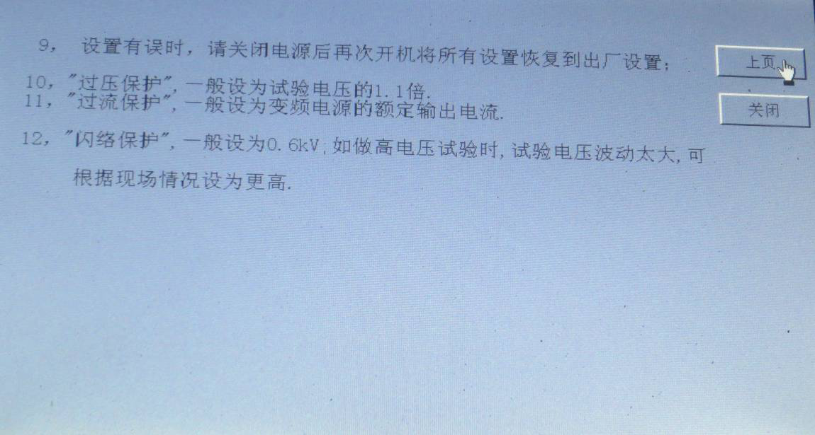 閃絡(luò)保護(hù):設(shè)置擊穿電壓的誤差值,且當(dāng)閃絡(luò)后液晶顯示屏須重新啟動