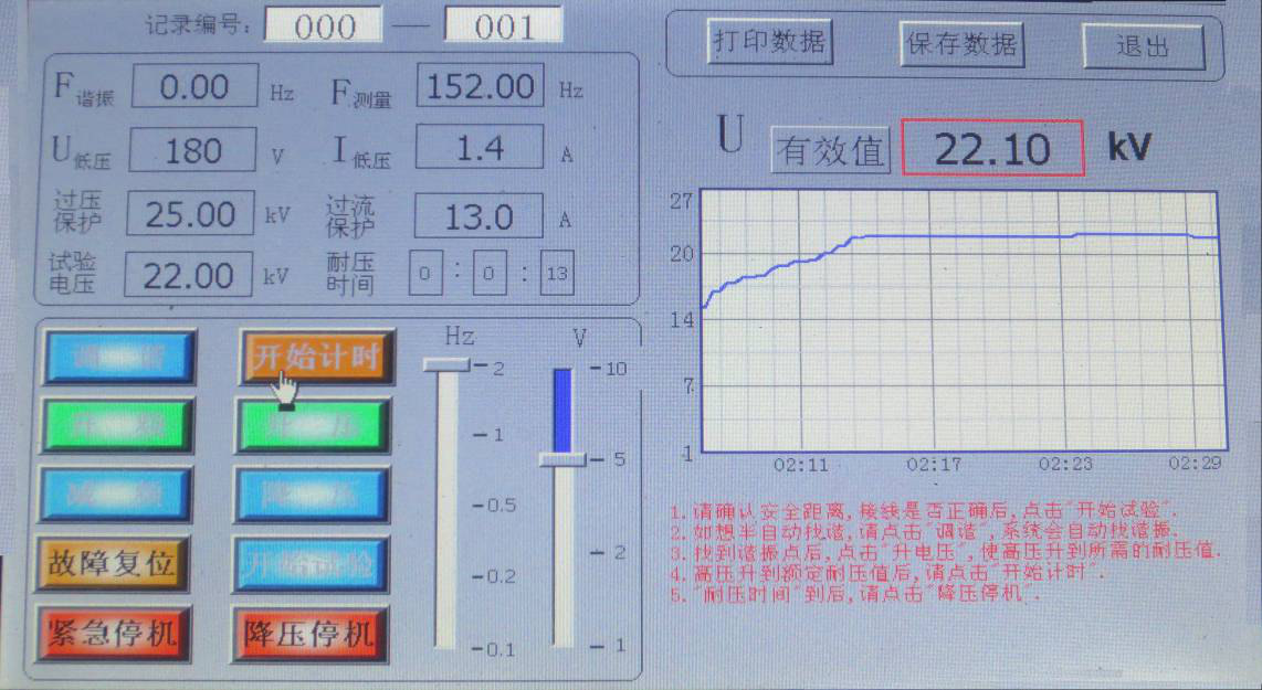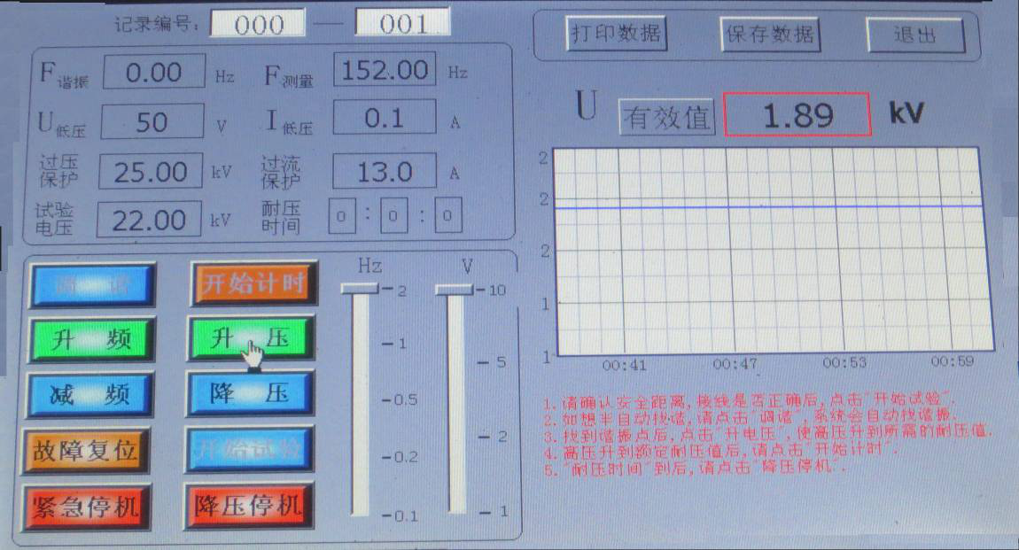 如不想自動找諧振點,先點擊“升電壓”,將“U低壓”升到50V,再點擊“升頻率”來找諧振點,找到諧振點后,點擊“升電壓”, 顯示界面如圖所示。