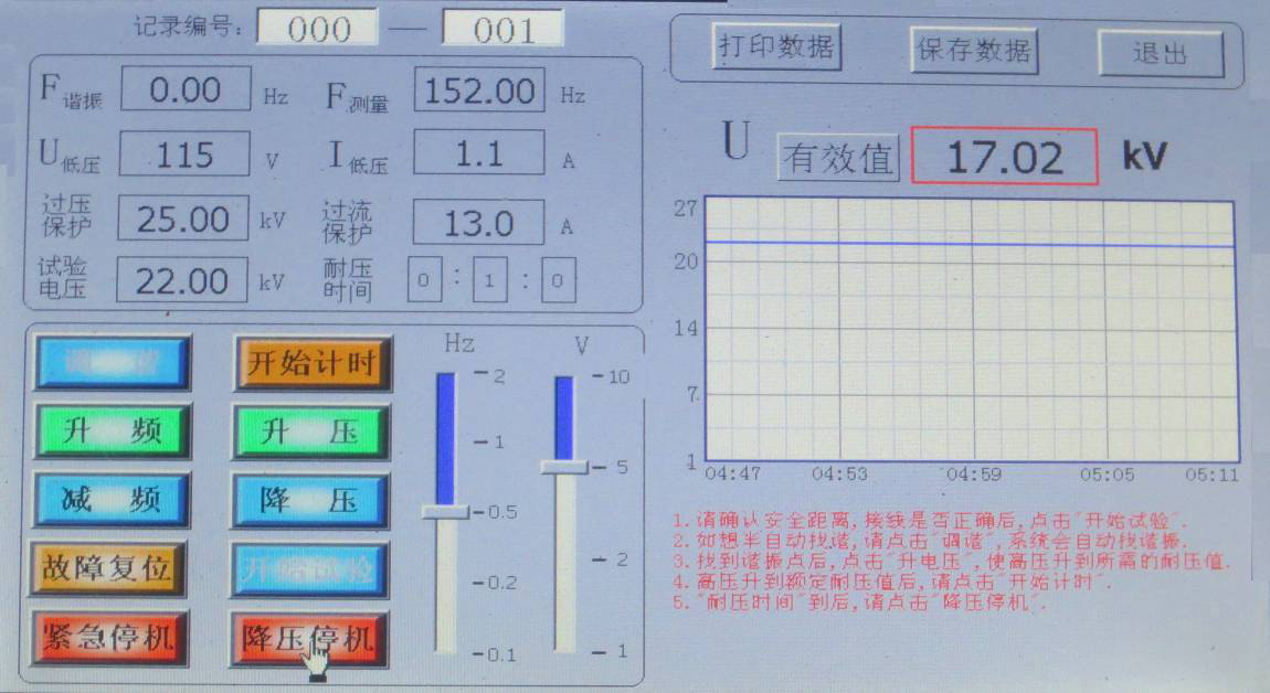當(dāng)U諧振電壓降壓0時,試驗完成,如想查詢試驗記錄,請在降壓前點擊保存數(shù)據(jù),降壓后點擊“文件管理”; 顯示界面如圖所示。