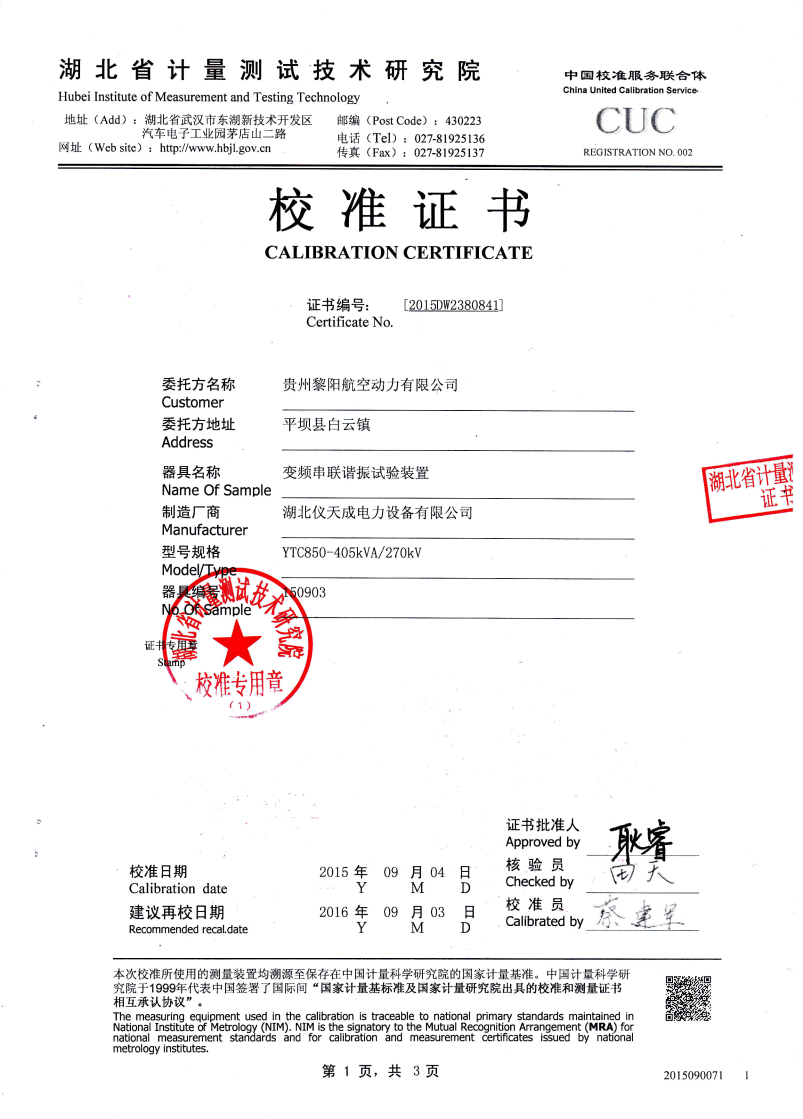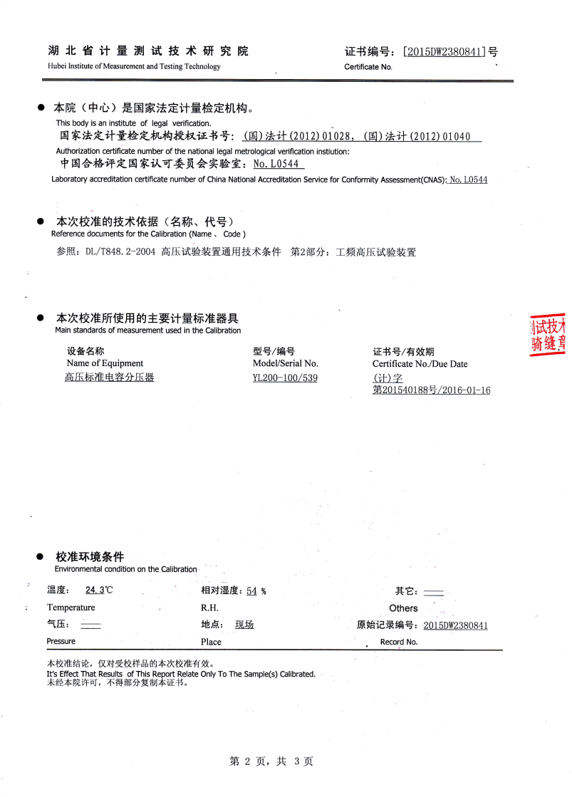 | YTC850-810/270 | 30kW | 30kVA | 45kV/2A/9臺 | 300kV | 110kV套管、GIS、支柱絕緣子、隔離開關(guān) |