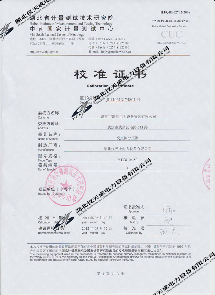 轉(zhuǎn)載:"YTC8106-50交直流分壓器的資質(zhì)證書" 請注明來源于儀天成電力。 更多技術(shù)問題請致電儀天成電力客戶服務:027-87876585,技術(shù)部專線:027-87876585,在線客服:719388481