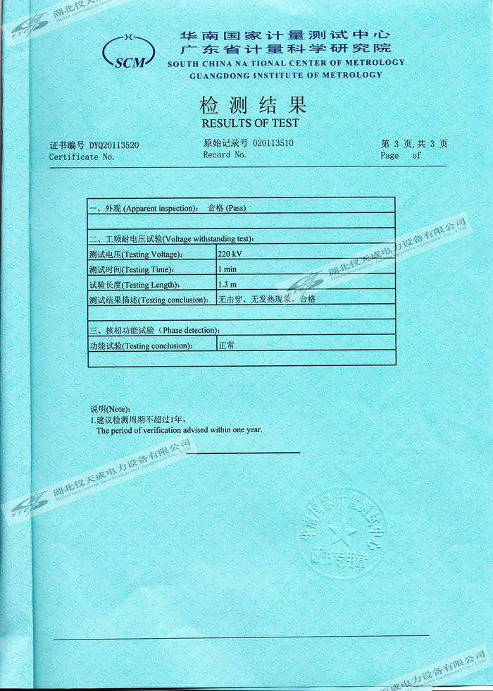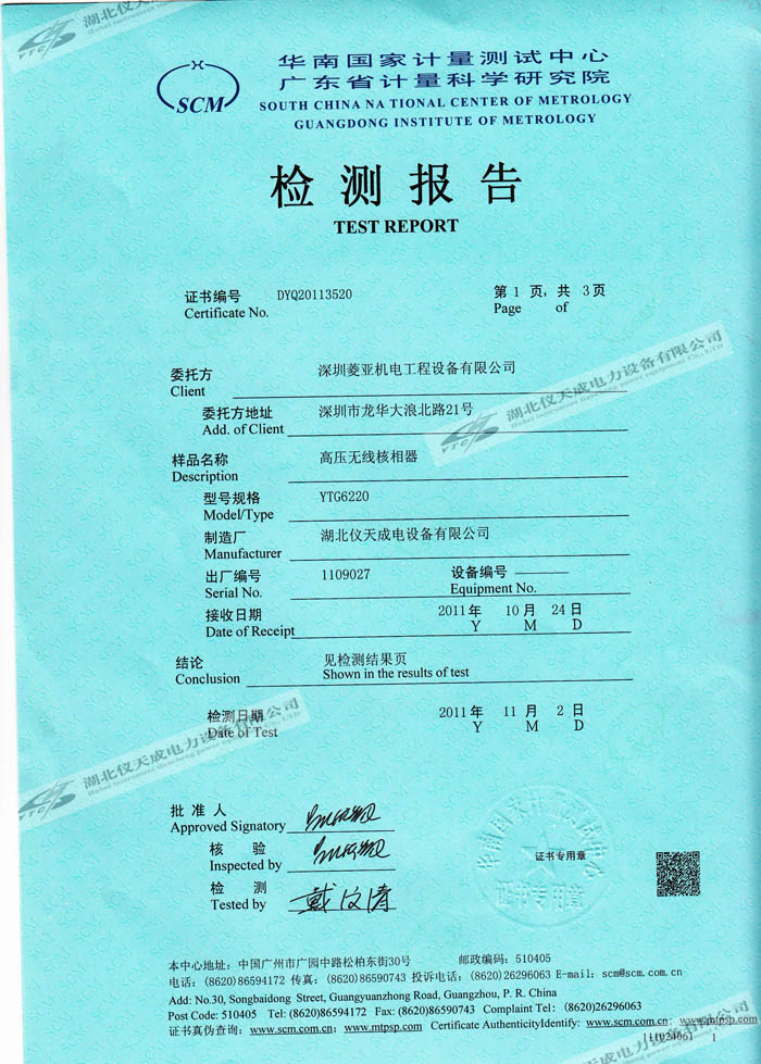 YTC6220高壓無線核相器的資質(zhì)證書