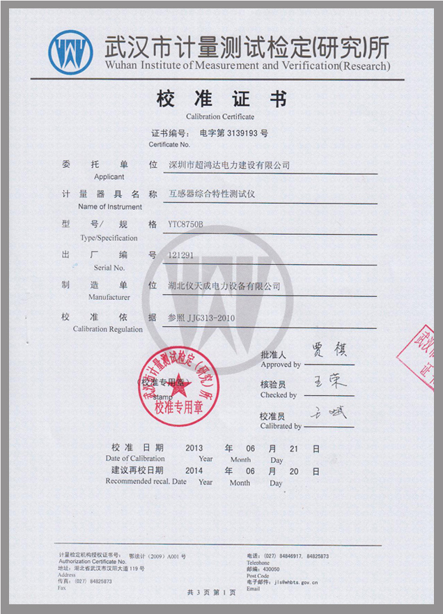 YTC8750B互感器伏安變比極性綜合測(cè)試儀鑒定證書